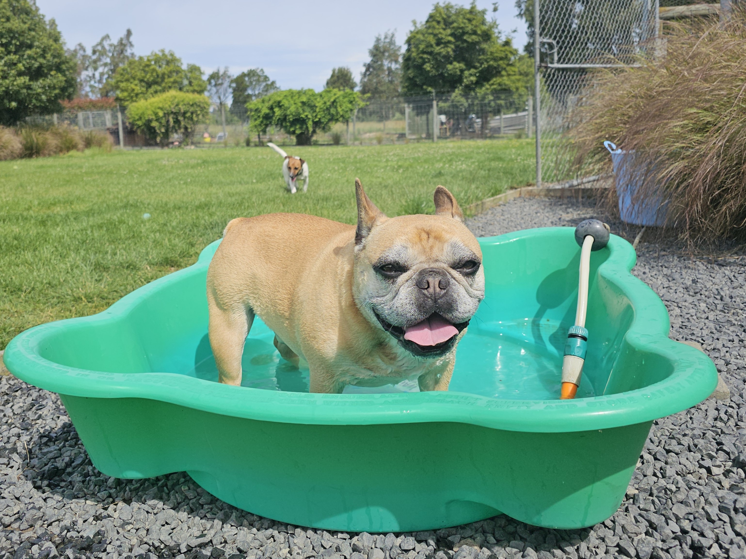 We have water play with a high-pressure hose and stock trough. It is all about sharing and the dogs patiently wait their turn in the trough, so if your dog enjoys water, they'll have access to it.